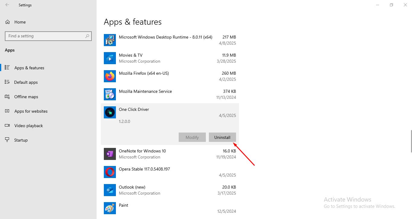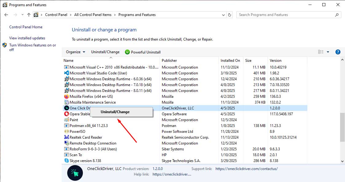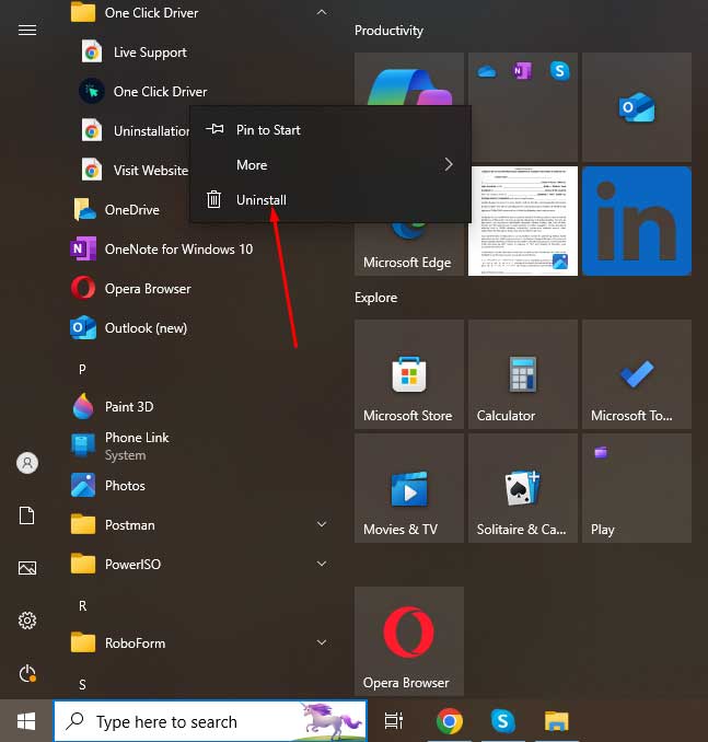 Right-click on the (One Click Driver Soft) application to select it, and choose ‘Uninstall’ from the options given.